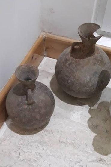 These jars were found inside a burial chamber in the Middle East. These finds can be dated back to the Sasanian Empire (224 to 651 AD).