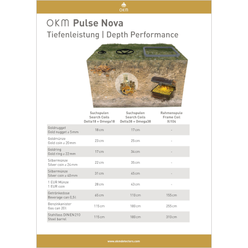 The Pulse Nova PI metal detector from OKM provides extra efficient scanning of the ground, detecting lost jewelry such as rings, charms and earrings, natural gold such as gold nuggets, and militaria such as old weapons and ammunition at depths of up to 3 m (9.8 ft).